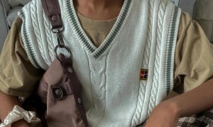 偶尔回归一下乖乖校园男孩风,V 领撞色色彩和谐,听说现在小奶狗是姐姐们的最爱?